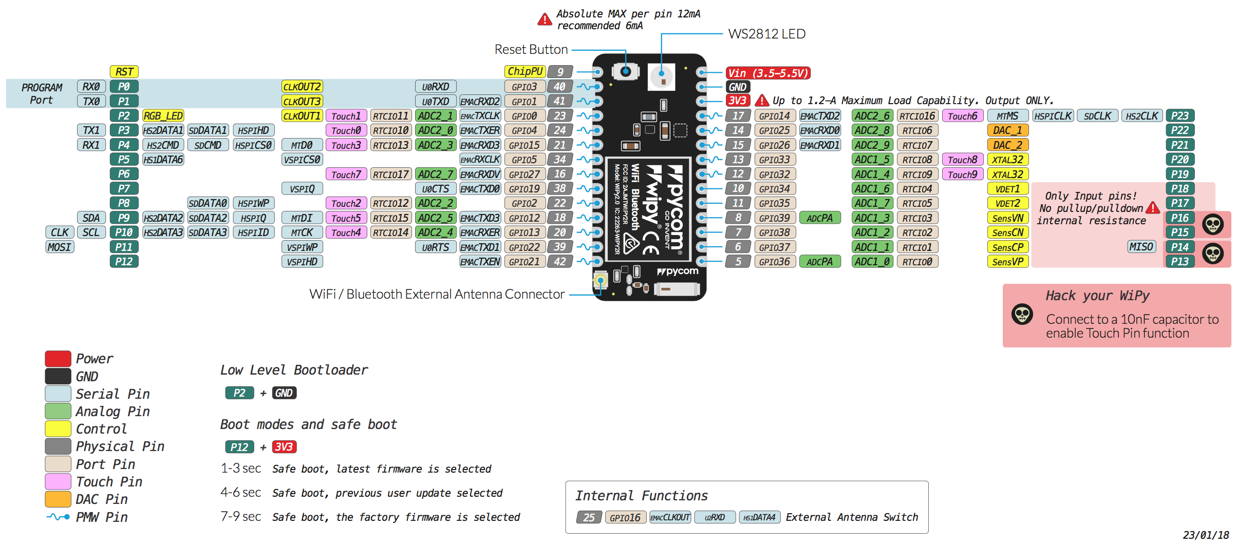 The pinout of the WiPy 2.0 is available as a PDF File.