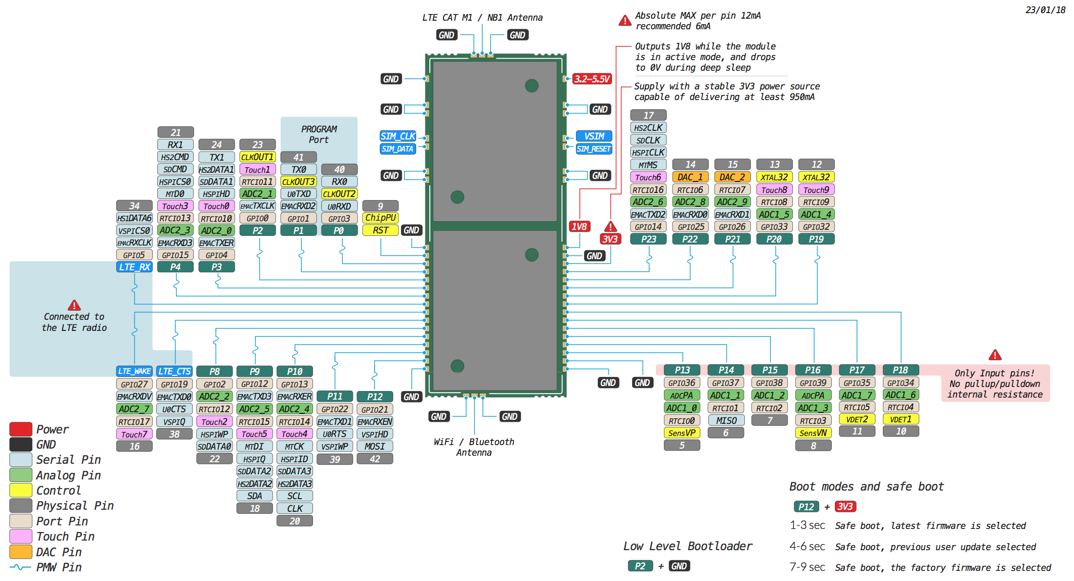 Please note that the PIN assigments for UART1 (TX1/RX1), SPI (CLK,MOSI,MISO) and I2C (SDA,SCL) are defaults and can be changed in Software.