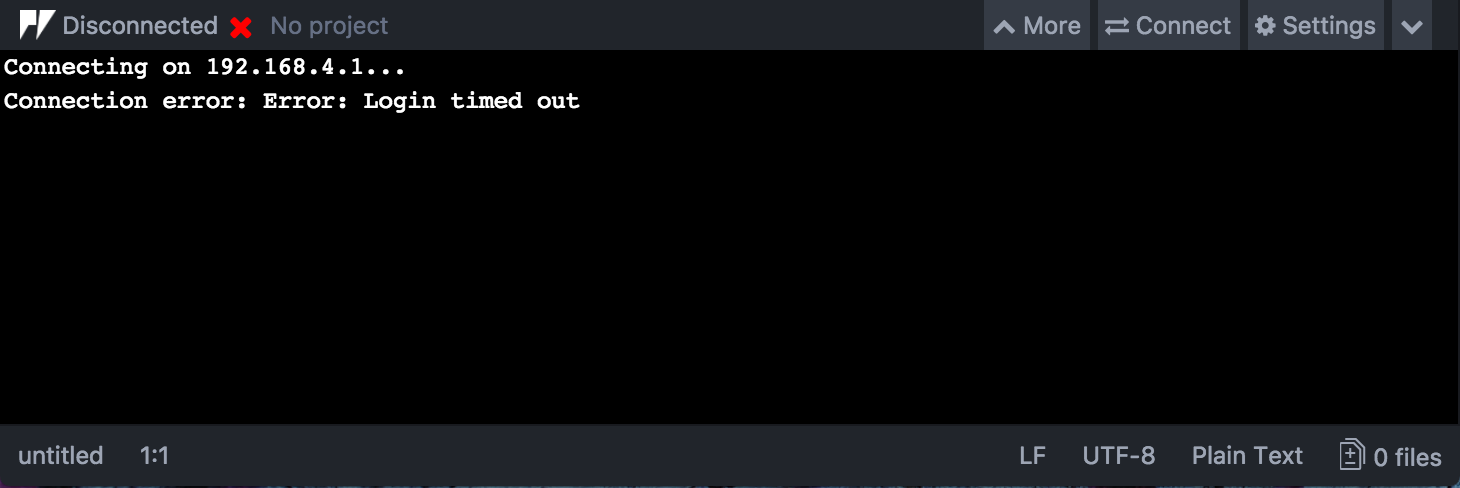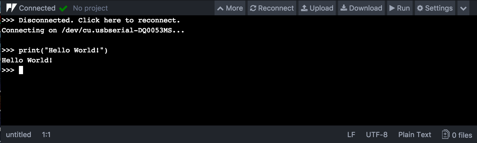 - Press connect and the Pymakr console should show three arrows '>>>', indicating that you are connected!