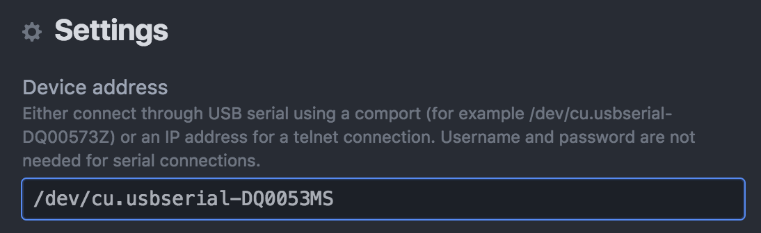 - Paste the serial address you copied earlier into the text field 'Device Address'