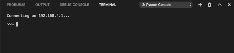 Use either the Connect command or click the Pycom console button on the left bottom and the connection process will take place. Upon completion, a message stating ‘Connecting on 192.168.4.1...’ will appear, followed a >>> prompt if successful.